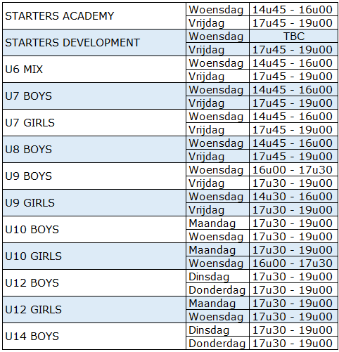 In de vakanties en op feestdagen zijn er geen trainingen gepland.